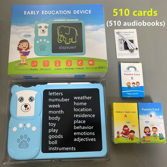 It comes with a total of 510 cards (audiobooks), with pronunciation of Shapes, animals, Days of the weeks, etc.